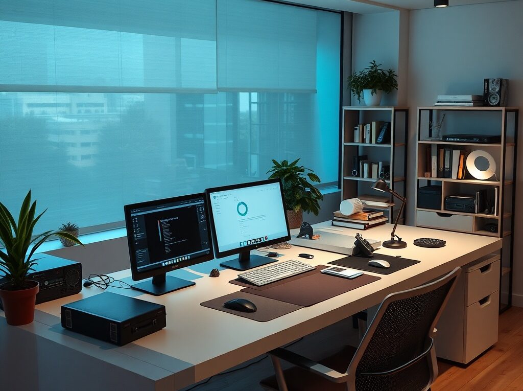 Молодой человек работает за столом у компьютера, книги и растения на заднем плане, освещено солнечным светом.
